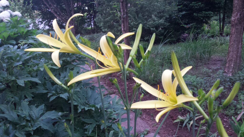 H. citrina var. ‘Citrina’ – 4-inch-wide lemon yellow flowers on 4-5 feet tall stalks; June-July bloomer opens after 6 p.m. daily
