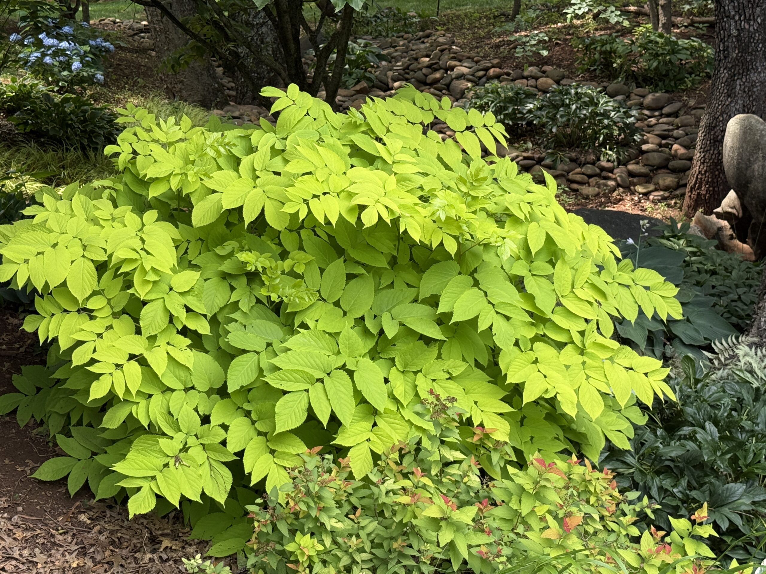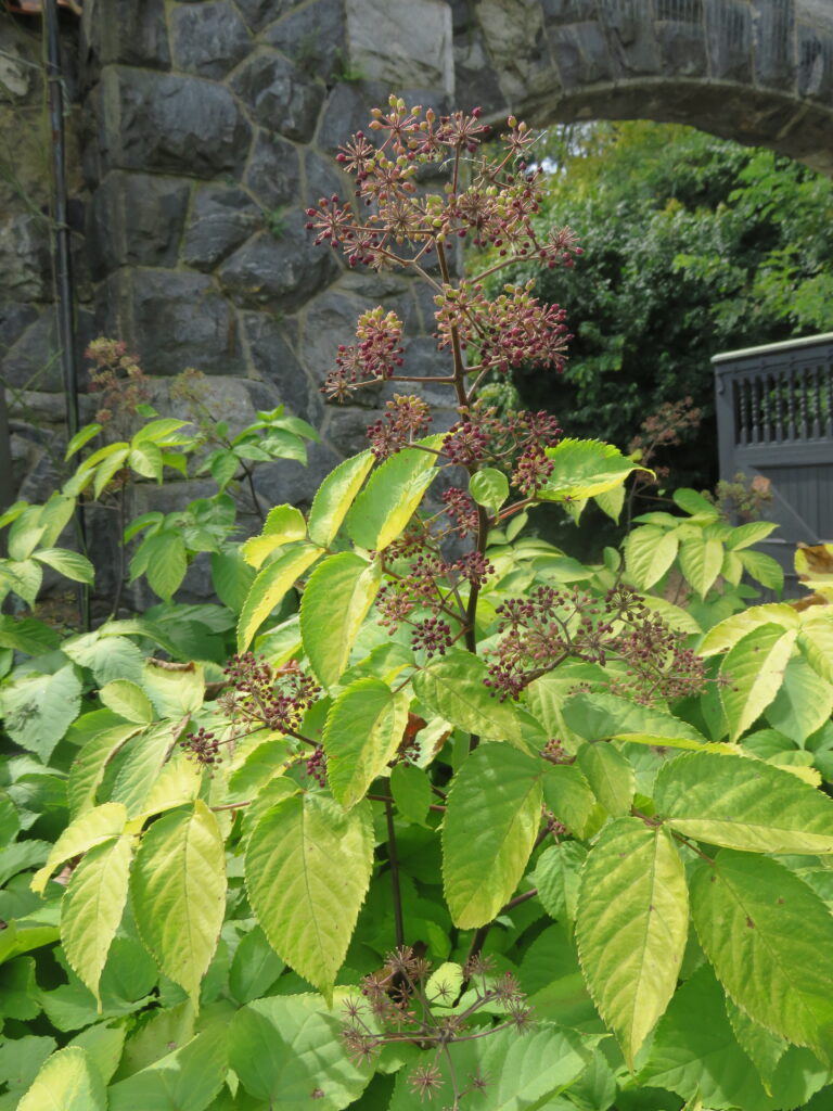 Sun King aralia makes a bold almost tropical statement in a semi-shade garden alongside variegated Solomon seals, hostas, brunneras, lungworts, bergenias, coral bells, and astilbes. It is a slow starter… The phrase “first year it sleeps, second year it creeps” fits Sun King to a tee. Grow it in a compost-rich moist soil and in ½-day sunlight (morning hours preferred).