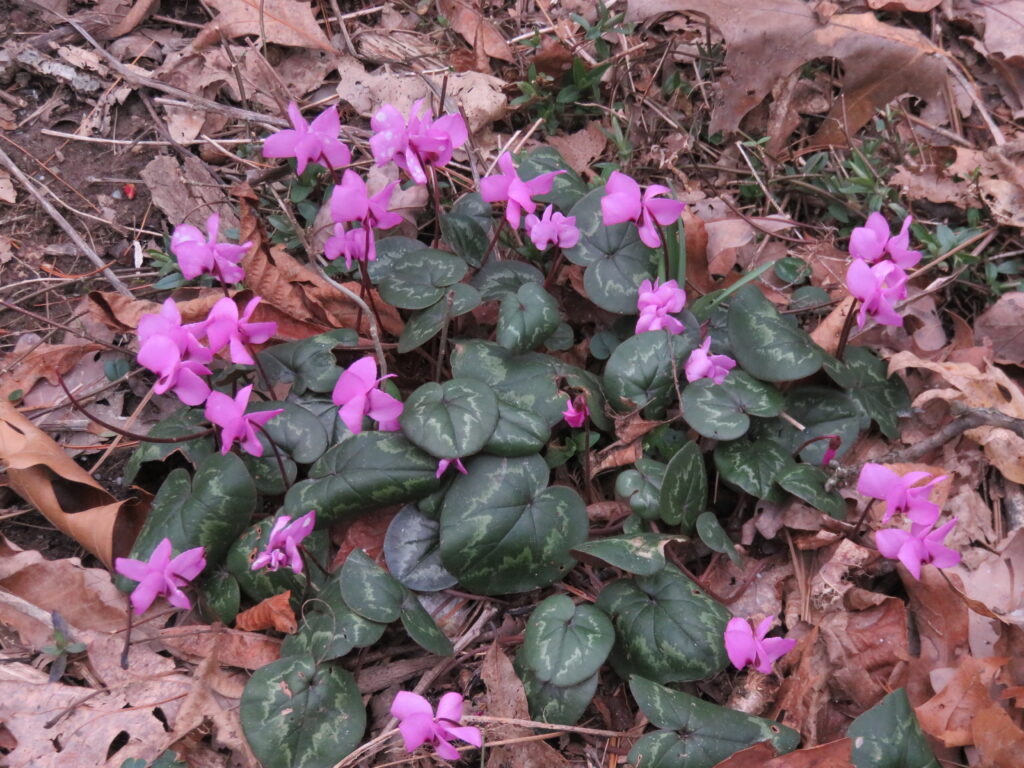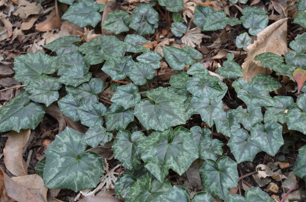 C. coum emerge from summer dormancy in October thru March and reenter dormancy in mid-spring as outdoor temps warm up. Leaves are round- to heart-shaped, with smooth or slightly toothed margins, from plain green through varying degrees of patterning in grey or silver to all over silver, underside purplish. At least a dozen more species are hardy in zones 7-9. C. hederifolium is dormant during the hot dry summers and fridge cold winters. Long-lived cyclamen often provides years of reliable color and interest with their handsome foliage.