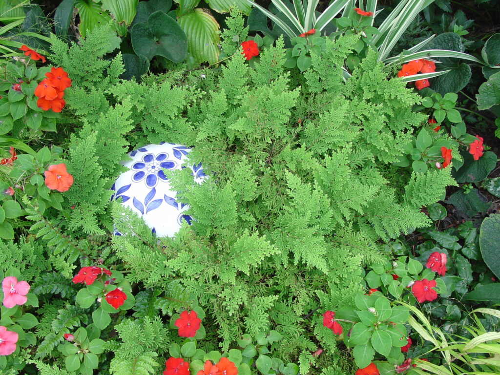 Spikemoss foliage is soft to the touch and low growing…a great groundcover filler for a woodland garden, pathway or shade container. Other species of Selaginellas thrive in terrariums and are fabulous companions to shade loving container plants.