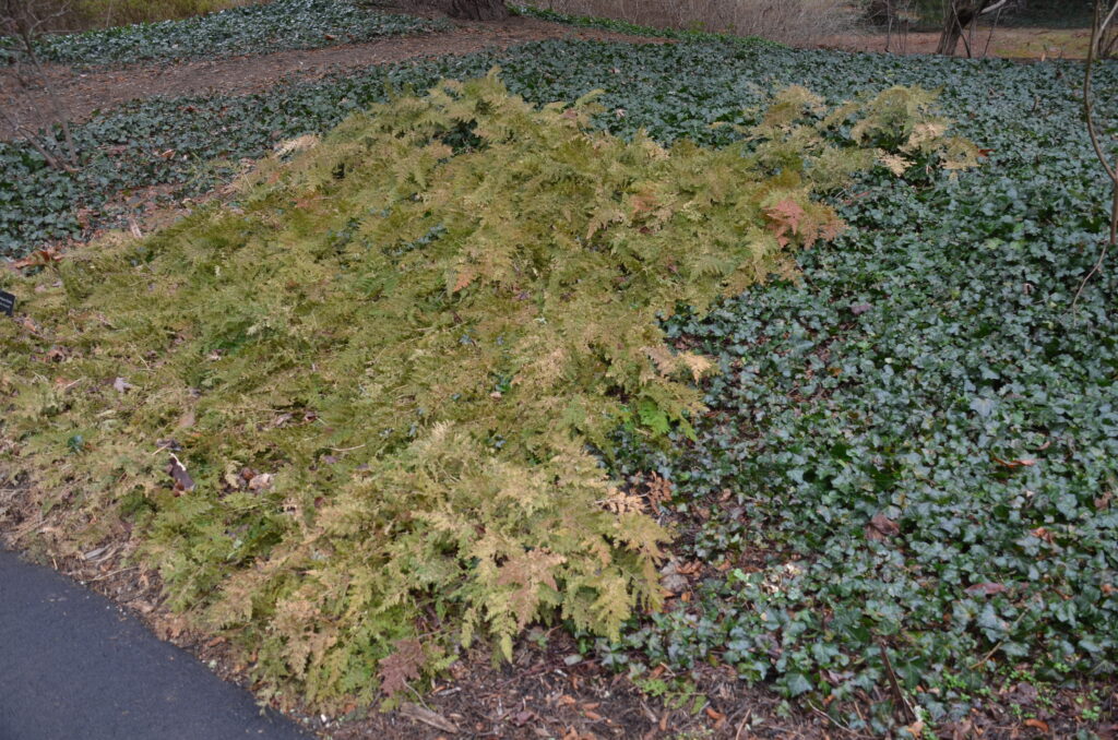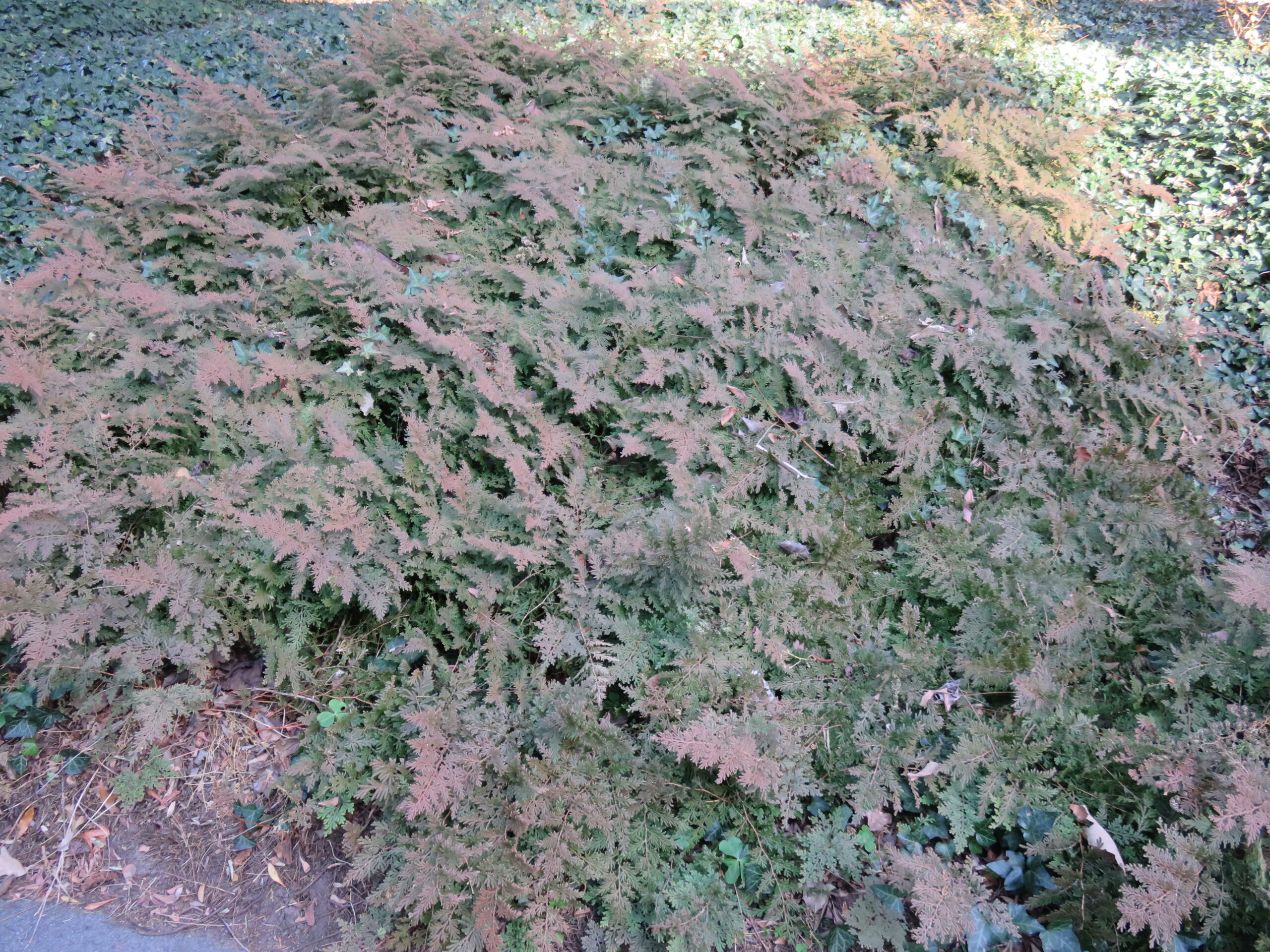 Over several years arborvitae fern will develop a dense ground cover that competes against most other vegetation. Fronds take on a coppery appearance once cool temps arrive in the fall.