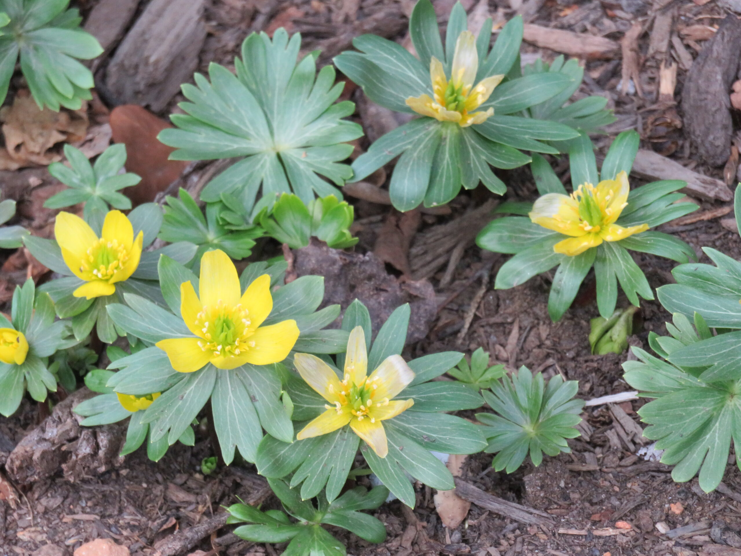 Winter Aconite (Eranthis hyemalis) is one of the earliest flowering tubers to bloom in USDA hardiness zones: 3-7, often appearing alongside snowdrops below. In early autumn, plant winter aconite 2 to 3 inches deep and about 3 inches apart. Winter aconite warms up the late winter landscape with 3 to 4 inches tall cheery yellow buttercup-like flowers. Bulbs freely multiply and naturalize freely by seed and bulb division. Grow in full sun to part shade with expected flowering time in February to March.