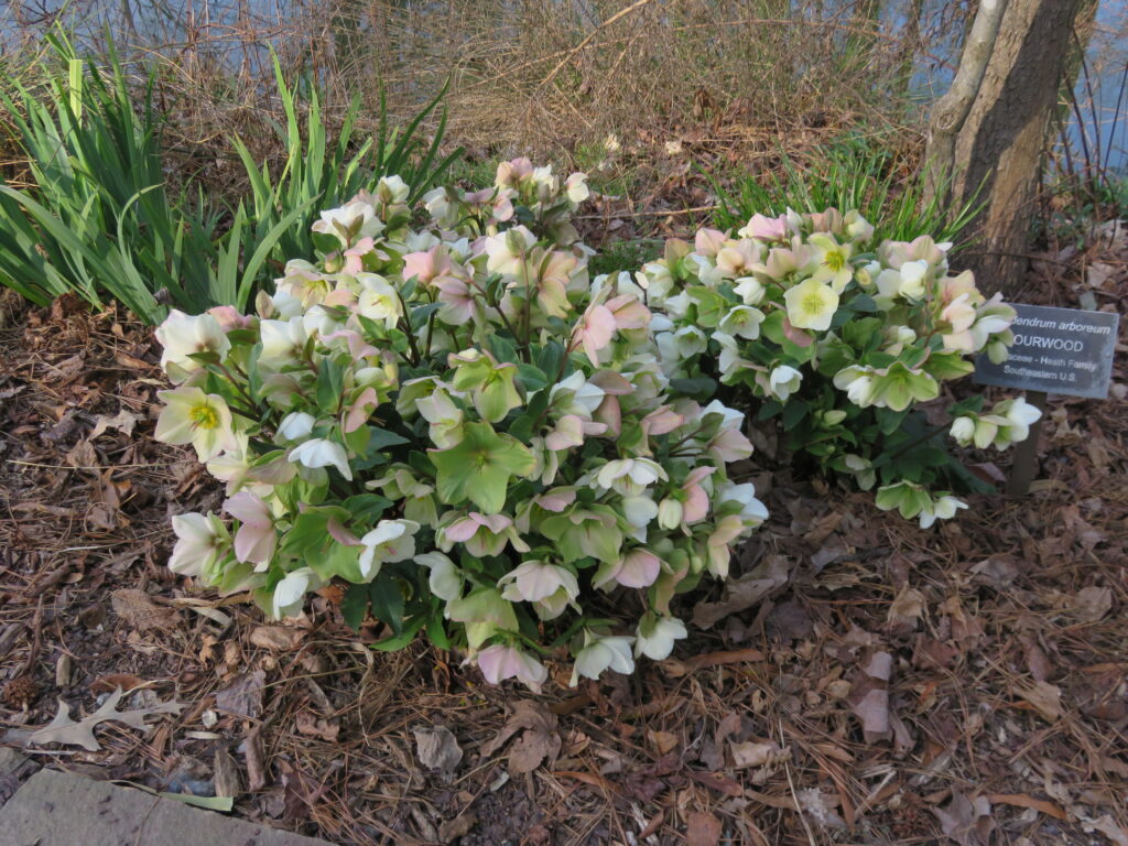 Lenten Roses (Helleborus spp. and hybrids), particularly those called “Christmas rose”, are evergreen perennials that begin flowering in late December here in zones 6b and 7. Their colorful flowers peak out through their also new foliage. In more northerly climes, Christmas roses may wait until mid-February, the traditional start of the Lenten period. Flowers appear very rose-like, some with double or bi-colored petals (USDA hardiness zones 4-9). Hellebores grow best in partial to full shade areas, and grow up to 24 inches tall and wide. For a showier floral display, clip off the old basal foliage back between Thanksgiving and Christmas.