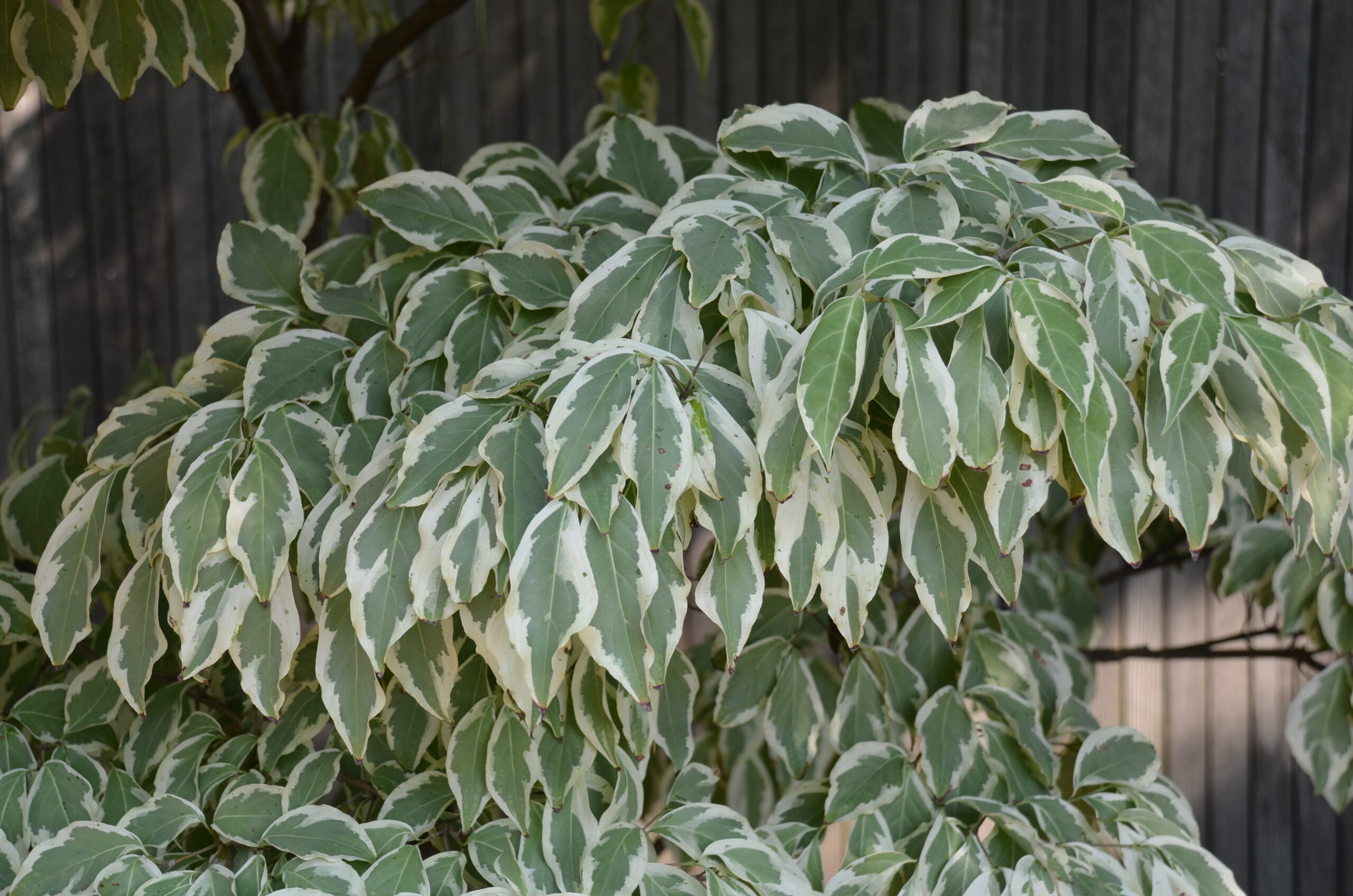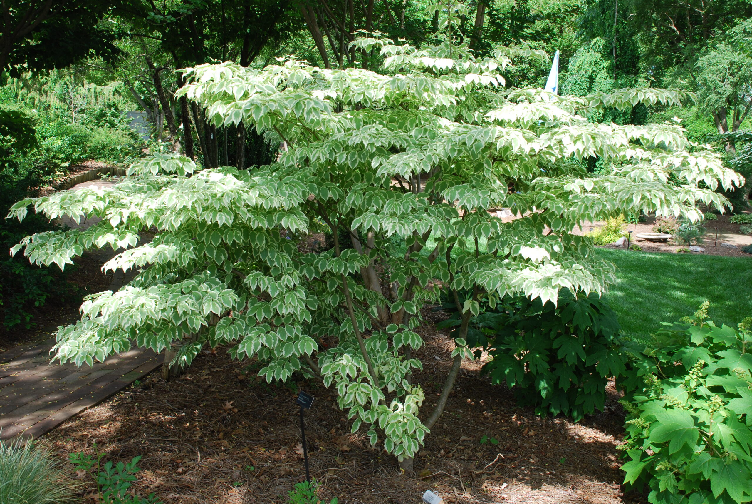 Kousa dogwood is indigenous to eastern Asia (Korea, China, and Japan) (USDA hardiness zones 5 – 8). ‘Wolf Eyes’ Kousa dogwood is an exceptional small landscape tree with variegated leaf color. Tree grows 15 – 20 feet tall and 20 feet wide. Hundreds of cream and green flowers appear in spring. Its narrow leaves are light green with creamy white margins. In mid- spring in Tennessee, this superior selection is covered with beautiful white flowers for about 3 weeks.